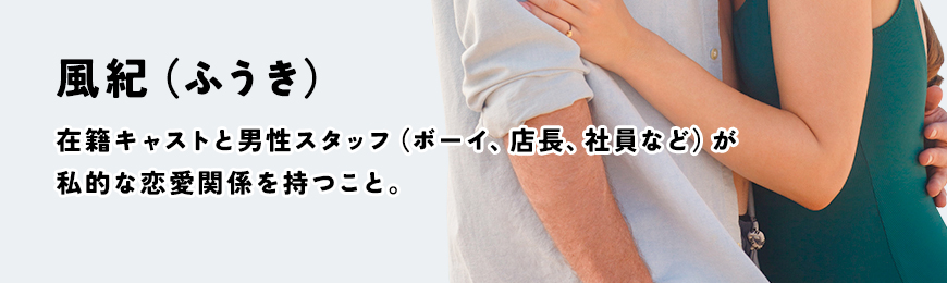 - 夜職の業界でよく使われる言葉の1つに「風紀」があります。風紀とは、キャバクラやガールズバーなどで、在籍キャストとボーイが私的な恋愛関係を持つことを指す業界用語です。多くの店舗では就業規則で厳しく禁止……