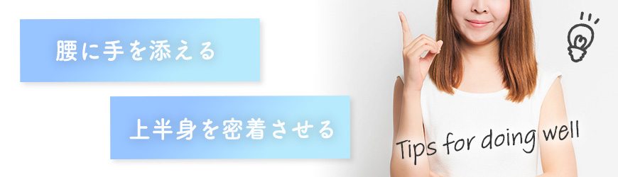 また、女性がバランスを保ちながら腰の動きに集中できるよう、男性側の胸板や太ももに手を置いてもらうとよいでしょう。男性はここでは焦らず、女性が体勢を整えるのを待ちます。