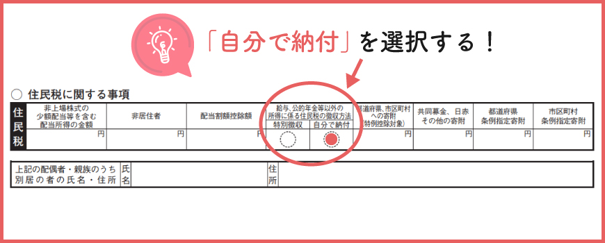 2つある欄のうち、「自分で納付」にマルを書くことで、副業分の住民税を自分で納付できます。