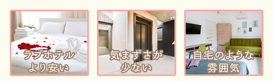 2つ目は、利用時に気まずい雰囲気を味わうリスクが低いことです。ラブホテルや一般的なホテルを利用するとき、繁華街の近くでは周囲の目が気になる方もいます。