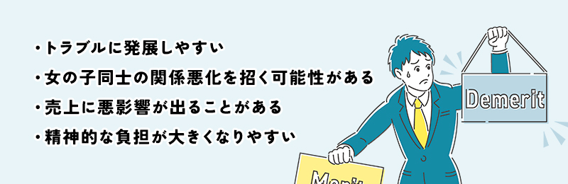 色管にはメリットがある一方で、デメリットやリスクも伴います。線引きの曖昧さによるトラブル、女の子同士の関係悪化、お客さんへの悪影響、精神的負担の増加など、慎重に対応すべき課題があります。ここでは、ボーイが色管をする際のデメリットを紹介します。