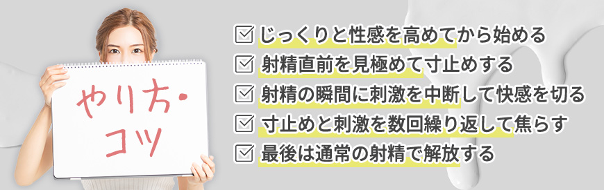 成功させるには段階的に性感を高め、限界のタイミングで刺激を止めるコントロールが重要です。自分で行うのが難しい場合は、風俗でプロのテクニックを体験してみるのがよいでしょう。