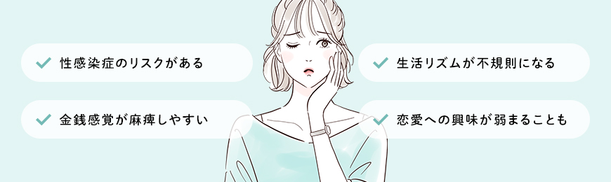 一方で、性感染症への対策や生活リズムの乱れ、金銭感覚の変化など、注意すべきリスクもあるので、衛生管理やシフト調整には注意を払いましょう。正しい知識を身につけ、自分らしい働き方を選ぶことが、心身のバランスを保ちながら続けるための第一歩です。