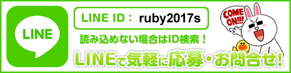 | 応 募 | お気軽に電話またはメールにて!応募の秘密厳守![]() ■お問合せ電話番号 048-254-8462 (携帯電話に転送される場合がございます) ■お問合せメールアドレス ruby2017ss@gmail.com (お問い合せフォームからお願いします。) ★24時間インフォメーションダイヤル 070-1462-0622 ■男子従業員募集中!! 要普通免許・35歳位まで ★お問い合わせダイヤル 048-254-8462 ■LINEで簡単応募! LINEでのご応募はこちらをクリック LINE ID : ruby2017s |